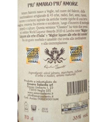 L’Amaro Salento è un elisir artigianale nato dall’inconfondibile gusto amabile ed equilibrato, frutto di un’arte artigianale che si fonda sulla complessità di ben 45 erbe, vegetali, radici, bucce, semi, fiori e rizomi accuratamente selezionati. Questa miscela straordinaria è un vero e proprio concerto di sapori, ognuno dei quali contribuisce all’armonia di questa creazione unica.