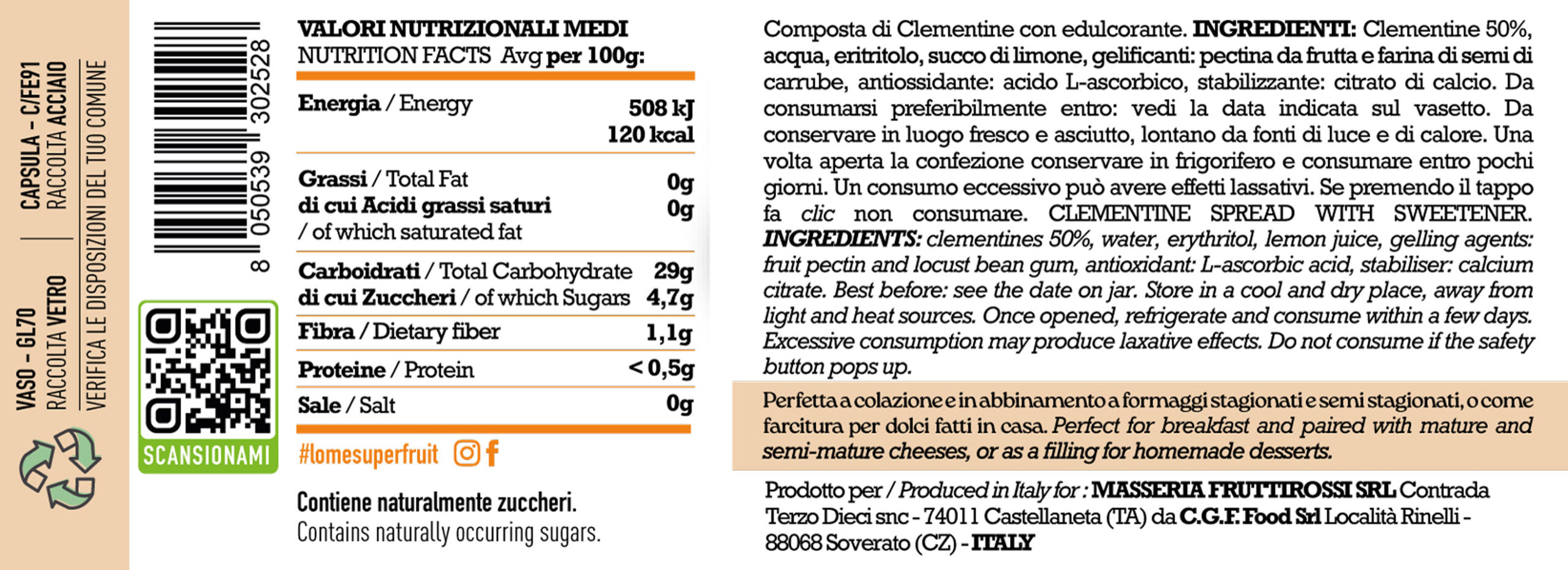 La Composta di Clementine è una deliziosa preparazione a base di 50% di clementine italiane, lavorate con cura per preservarne al meglio il sapore fresco e agrumato. La ricetta è pensata per chi cerca un’alternativa sana e genuina alle classiche confetture, senza rinunciare al piacere della frutta. Completano la lista degli ingredienti acqua, eritritolo (un dolcificante naturale a basso contenuto calorico), succo di limone per esaltare la nota agrumata, pectina da frutta e farina di semi di carrube come gelificanti, acido L-ascorbico (vitamina C) come antiossidante e citrato di calcio come stabilizzante.
