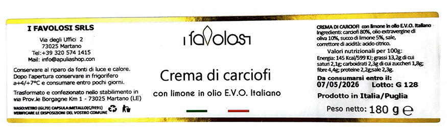 La Crema di Carciofi sott’olio della linea di prodotti “I Favolosi”, prodotta nel cuore della Puglia, è una vera espressione dell’arte culinaria italiana. Infatti questo prodotto, unisce la tradizione della terra pugliese all’innovazione dei sapori.