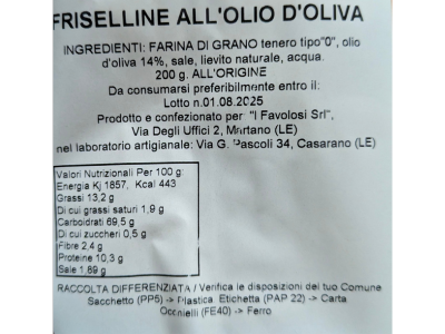 Oltre al loro sapore eccezionale, le friselline all’olio d’oliva rappresentano una scelta salutare. Sono realizzate con ingredienti naturali, senza conservanti o additivi artificiali. L’olio d’oliva extravergine utilizzato è noto per i suoi benefici per la salute, ricco di antiossidanti e grassi monoinsaturi che possono contribuire a una dieta equilibrata.
