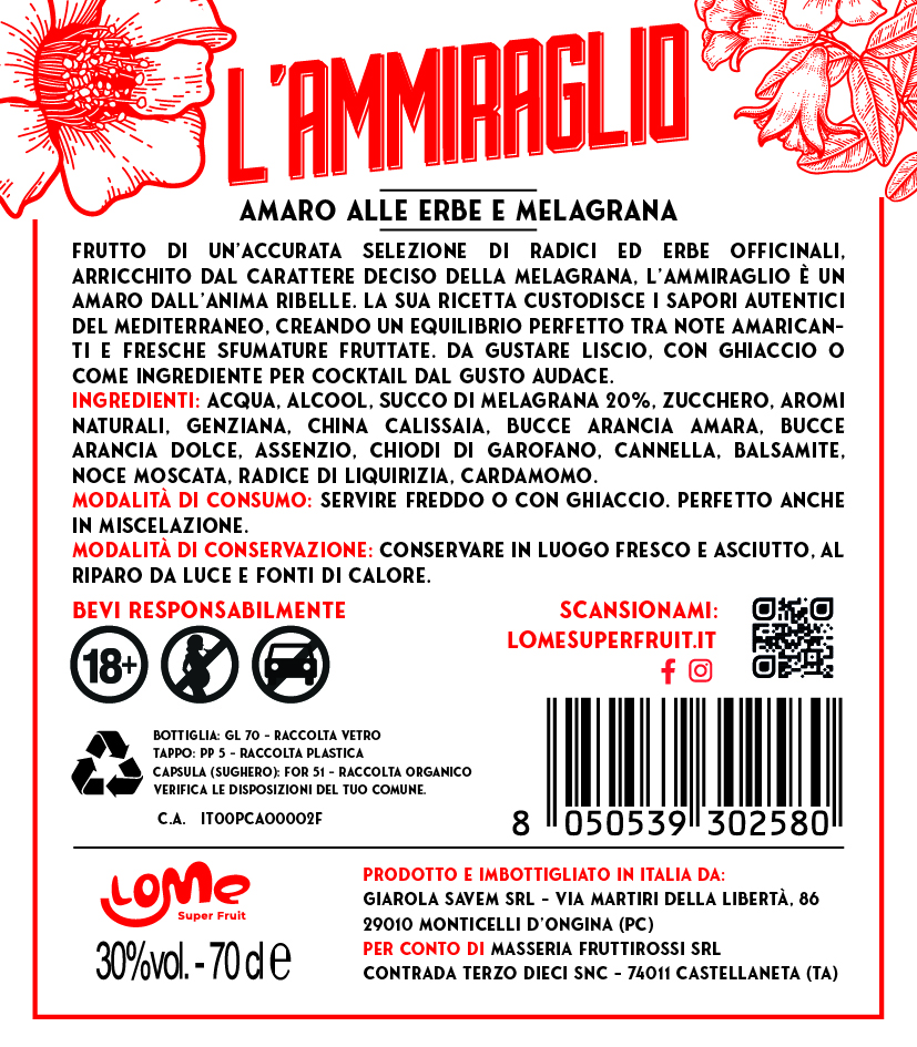 L’Ammiraglio Elixir amaricante è un amaro artigianale che nasce da una ricetta tradizionale mediterranea. Inoltre, è sapientemente rielaborato per offrire un gusto unico e complesso. Questo elisir si distingue soprattutto per la presenza del succo di melagrana al 20%, che aggiunge una nota fruttata e leggermente acidula. Di conseguenza, bilancia perfettamente la componente amaricante tipica di questi liquori.
