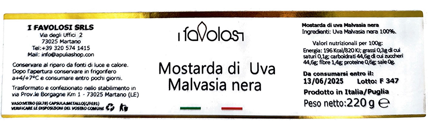 Preparata con ingredienti naturali e di alta qualità , questa mostarda artigianale viene lavorata con attenzione e passione, mantenendo inalterate le proprietà nutritive e organolettiche dell’uva Malvasia. Il risultato è, quindi, una mostarda dal sapore ricco, avvolgente e raffinato, che conquista per la sua freschezza e il suo carattere.