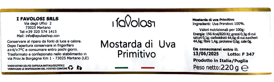 Oltre al suo sapore intenso, la mostarda  è un prodotto sano e naturale. L’uva Primitivo, ricca di polifenoli e antiossidanti, conferisce alla mostarda proprietà benefiche. Non contiene conservanti o additivi chimici, per un’esperienza autentica e salutare.