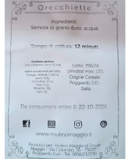 Le Orecchiette di Grano Duro del Mulino Maggio sono il risultato di questo impegno costante nella creazione di prodotti eccezionali. Questa pasta è realizzata con grande cura e attenzione, utilizzando grano duro di alta qualità selezionato nei campi della zona. La loro forma caratteristica, simile a piccole orecchie, è perfetta per catturare la salsa e creare una combinazione di sapori e consistenza straordinaria.