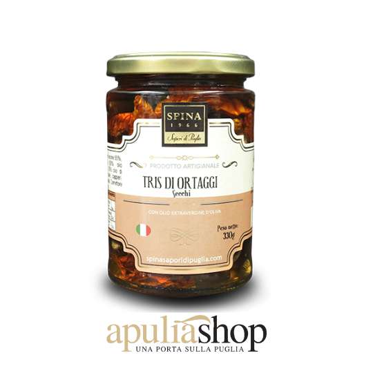 Il Tris di Ortaggi Secchi Sott’olio dell’azienda Spina Sapori di Puglia è una vera e propria sinfonia di sapori e colori del Mediterraneo.